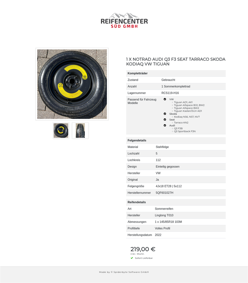 1 X NOTRAD AUDI Q3 F3 SEAT TARRACO SKODA KODIAQ VW TIGUAN