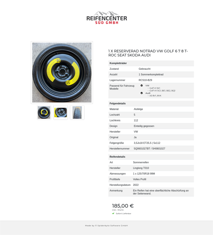 1 X RESERVERAD NOTRAD VW GOLF 6 7 8 T-ROC SEAT SKODA AUDI