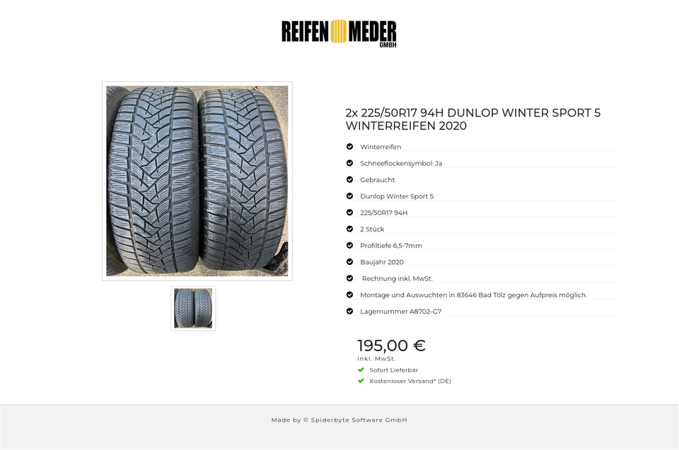 ★ KOSTENLOSER – VERSAND ★ Zum Verkauf stehen zwei gebrauchte Winterreifen in der Größe 225/50R17 94H vom Hersteller Dunlop im Profil Winter Sport 5 mit Schneeflockensymbol Die Reifen sind aus der Produktion 2020. Die Profiltiefe beträgt 6,5…