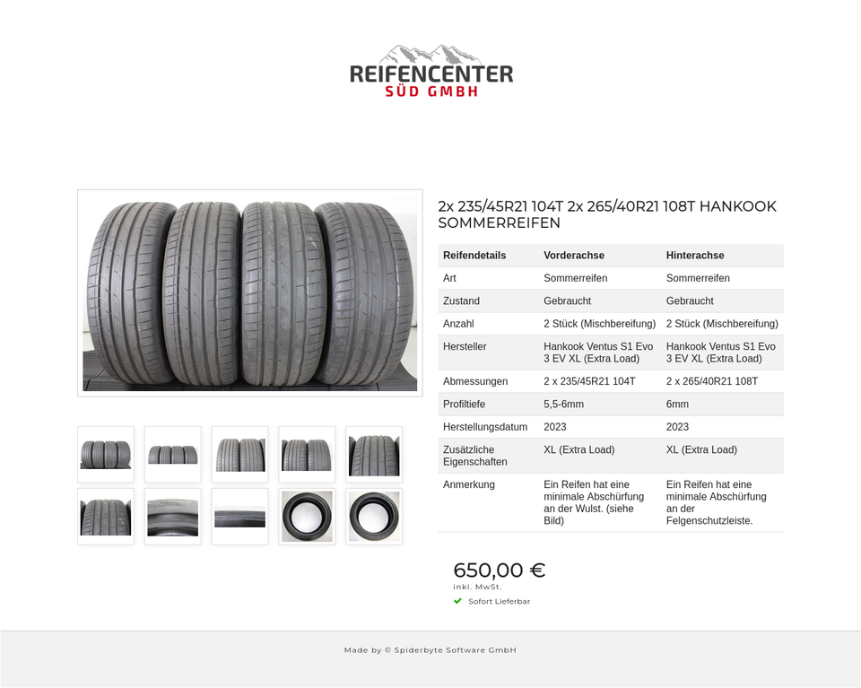 â–º KOSTENLOSER VERSAND â—„ 2x 235/45R21 104T 2x 265/40R21 108T HANKOOK SOMMERREIFEN _________________________________________________________ Reifendetails: â–º Zustand: Gebraucht â–º Anzahl: 4 Stück Vorderachse: â–º Spezifikation: Sommerreifen â–º Reife…