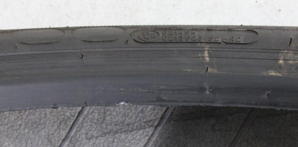 ► Anmerkung: Ein Reifen wurde geflickt und hat eine kleine Abschürfung an der Wulst. Ein Reifen hat minimale oberflächliche Abschürfung im Profil. (siehe Bild)