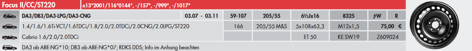 Die Felgen sind für die Reifengrößen 205/55R16 M+S und 205/55R16 geeignet. (siehe Bild 2)